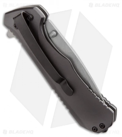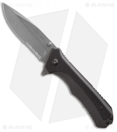The SCH502S Drop Point folder from Schrade features a serrated, stonewashed blade with flipper and thumb studs. Black G-10 and aluminum handle with steel liner lock frame, pocket clip and glass breaker tip. The SCH502 flipper is easy to use, stylish and built for everyday use.