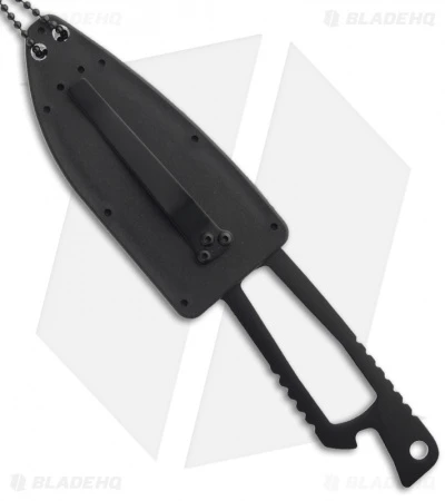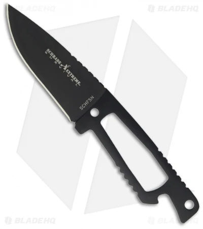The Schrade SCHF5N neck knife from Schrade is a slim, lightweight fixed blade with multiple carry options. The stainless steel blade is drop point shaped with a tactical black finish. The handle is skeletonized and also has a built in bottle opener feature. Included is a hard sheath with removable pocket clip, bead chain and lanyard.