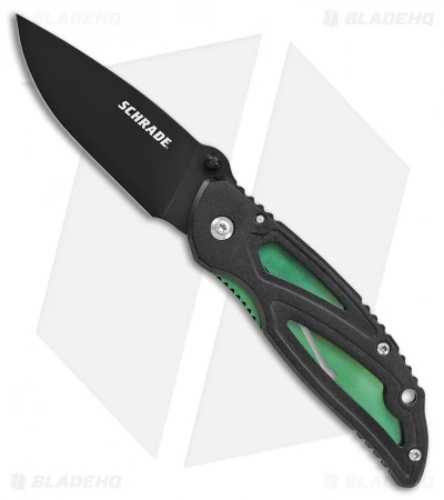 - Skeletal black aluminum handle with green liner lock mechanism.