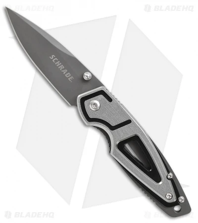 This Schrade SCH224 folder offers a unique layered aluminum handle and a gray coated blade. The handle consists of a stainless steel frame with layered aluminum scales in a gunmetal gray finish. The stainless steel blade comes with a gray coating and a plain edge. A stainless steel pocket clip completes the EDC design.