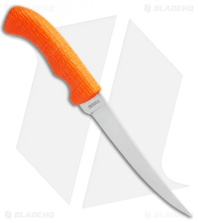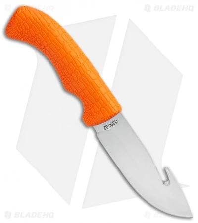 This Blaze knife set is great for hunting, fishing, and outdoor use. Includes a filet knife, a fixed blade knife, and a fixed blade knife with a guthook. Each is made with a durable stainless steel blade and blaze orange rubber handles. The pack comes with a single nylon sheath that houses all four tools.